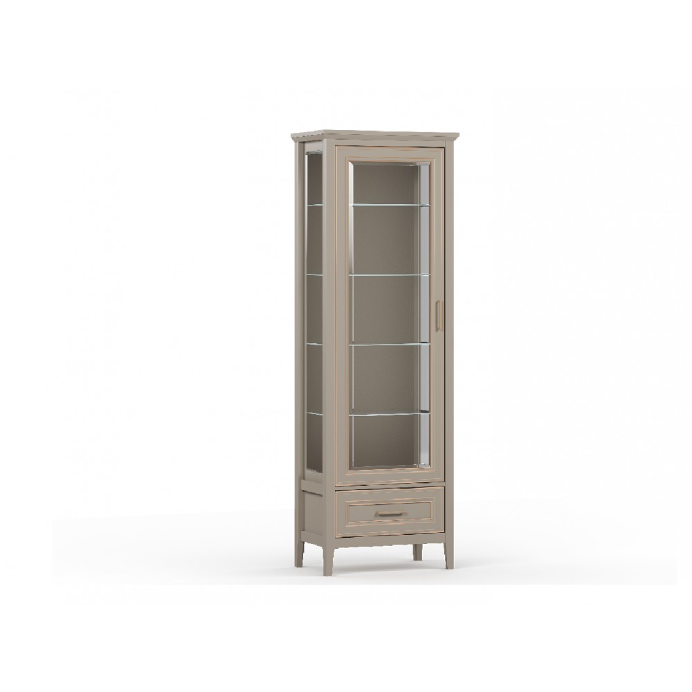 1 распашная дверь со стеклянной вставкой (стекло с фацетом) и 1 выдвижной ящик.Боковые стенки — стеклянные.Декоративная планка из МДФ с патиной.Дверь может устанавливаться как с правой стороны, так и с левой.Бесшумное закрывание.Стильные металлические ручки.Высокие ножки.Цвет корпуса: Глиняный серый.Цвет фасада: Глиняный серый.