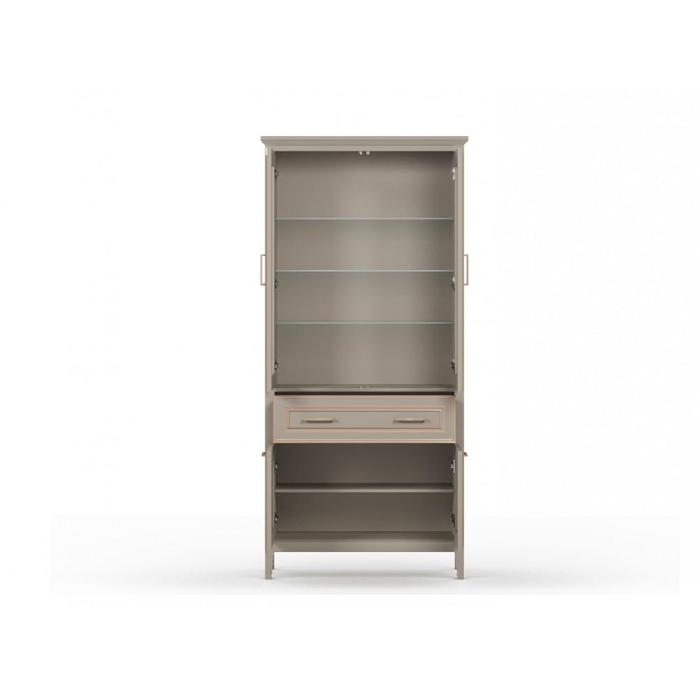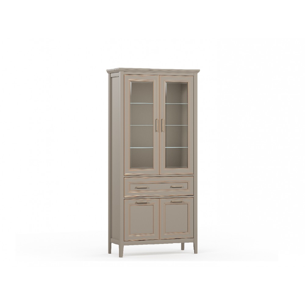 В верхней части шкафа расположены 2 распашные двери со стеклянными вставками (стекло с фацетом).В нижней части — выдвижной ящик и 2 глухие распашные двери.Декоративная планка из МДФ с патиной.Бесшумное закрывание.Стильные металлические ручки.Высокие ножки.Цвет корпуса: Глиняный серый.Цвет фасада: Глиняный серый.