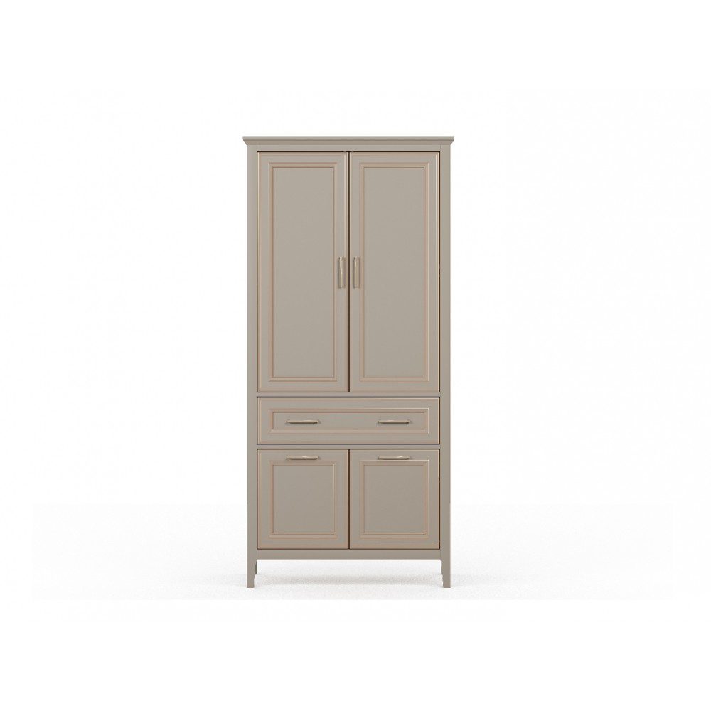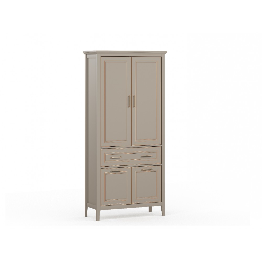В верхней части шкафа расположены 2 глухие распашные двери.В нижней части — выдвижной ящик и 2 глухие распашные двери.Декоративная планка из МДФ с патиной.Бесшумное закрывание.Стильные металлические ручки.Высокие ножки.Цвет корпуса: Глиняный серый.Цвет фасада: Глиняный серый.