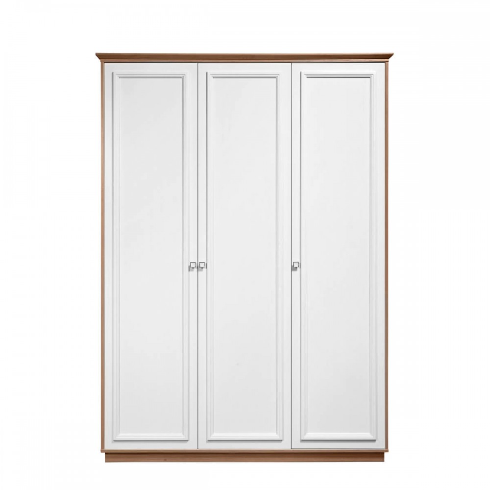 Количество дверей: 3-х дверный.Комплектация: без зеркал.Фурнитура: лицевая фурнитура и петли от компании Boyard (Китай).Фасад: плита МДФ, облицованная шпоном дуба, накладки из массива дуба.Корпус: плита МДФ, облицованная шпоном дуба, ЛДСП (внутренние поверхности).Карниз: массив дуба.Опоры, цоколь: массив дуба.Цвет: Белый/ Натуральный дуб.