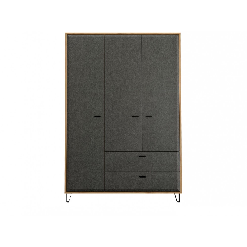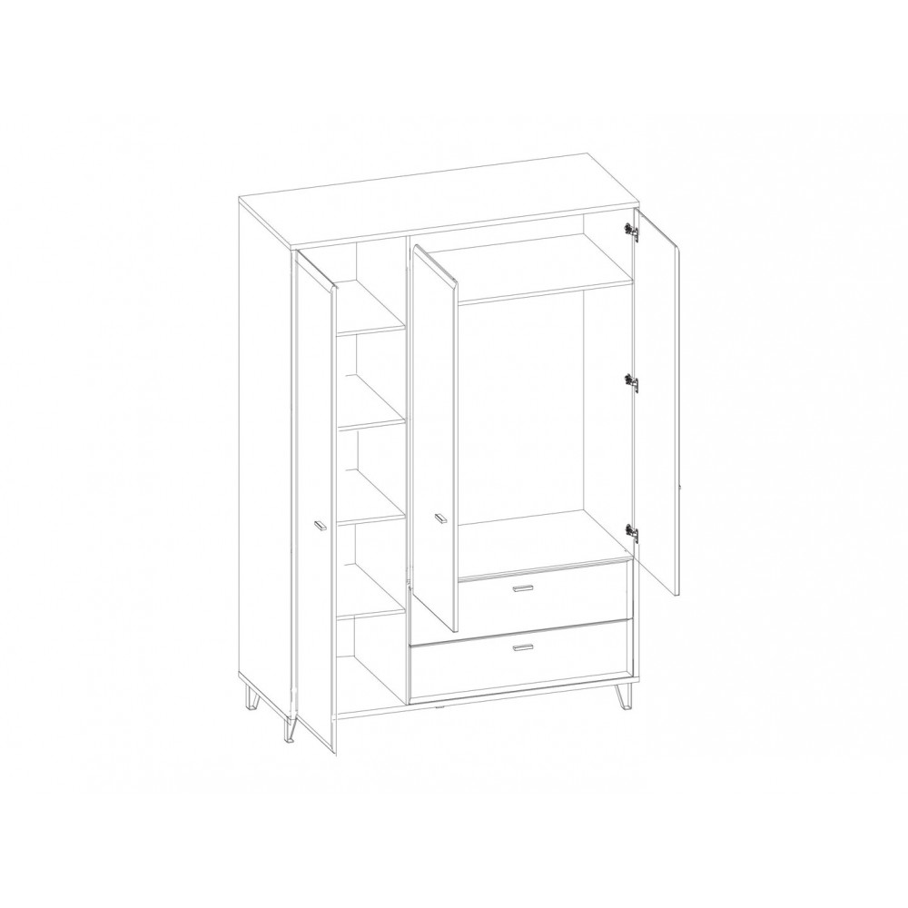 За левой дверью расположено 5 ячеек для хранения.За 2 распашными дверями — стационарная штанга для одежды и полка.2 вместительных выдвижных ящика на направляющих скрытого монтажа с функцией плавного закрывания.Скругленная форма фасадов.Черные металлические ручки.Стильные металлические ножки.Цвет корпуса: Дуб Наварра.Цвет фасада: Графит.