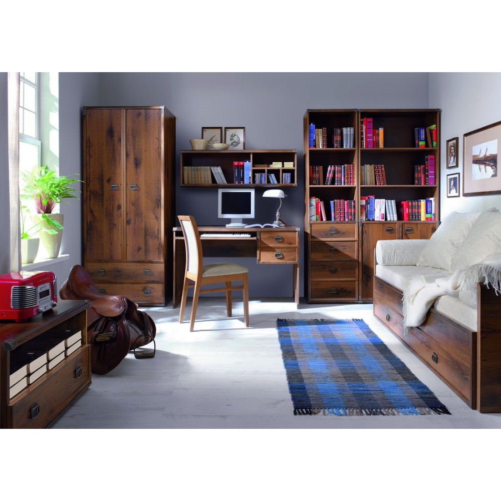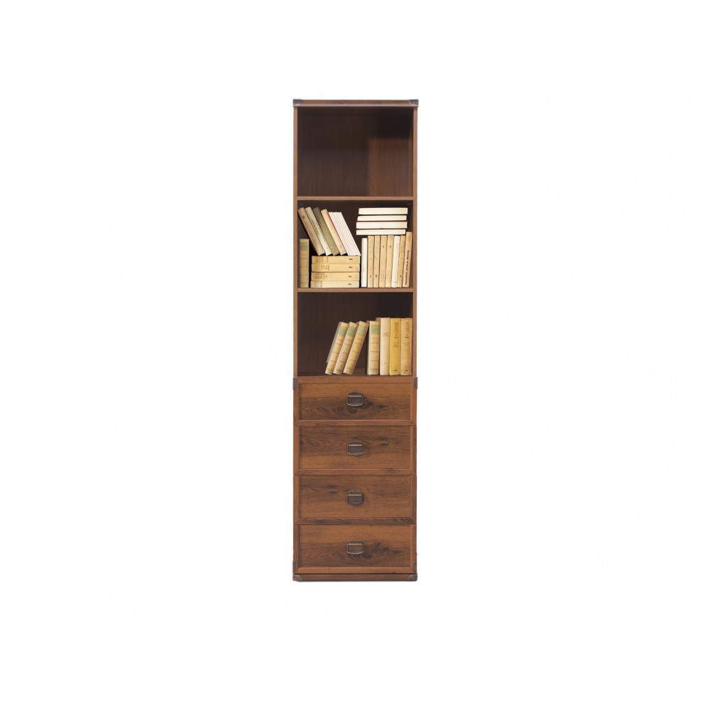Шкаф разделен на 2 отделения: верхнее –открытое отделение с полками из ДСП, нижнее – 4 выдвижных ящика на металлических роликовых направляющих.Оригинальные металлические ручки.Металлические накладки на уголках.Отличный вариант для оформления рабочего места Вашего ребенка, гостиной комнаты.Цвет: Дуб саттер.Цвет: Сосна каньйон.