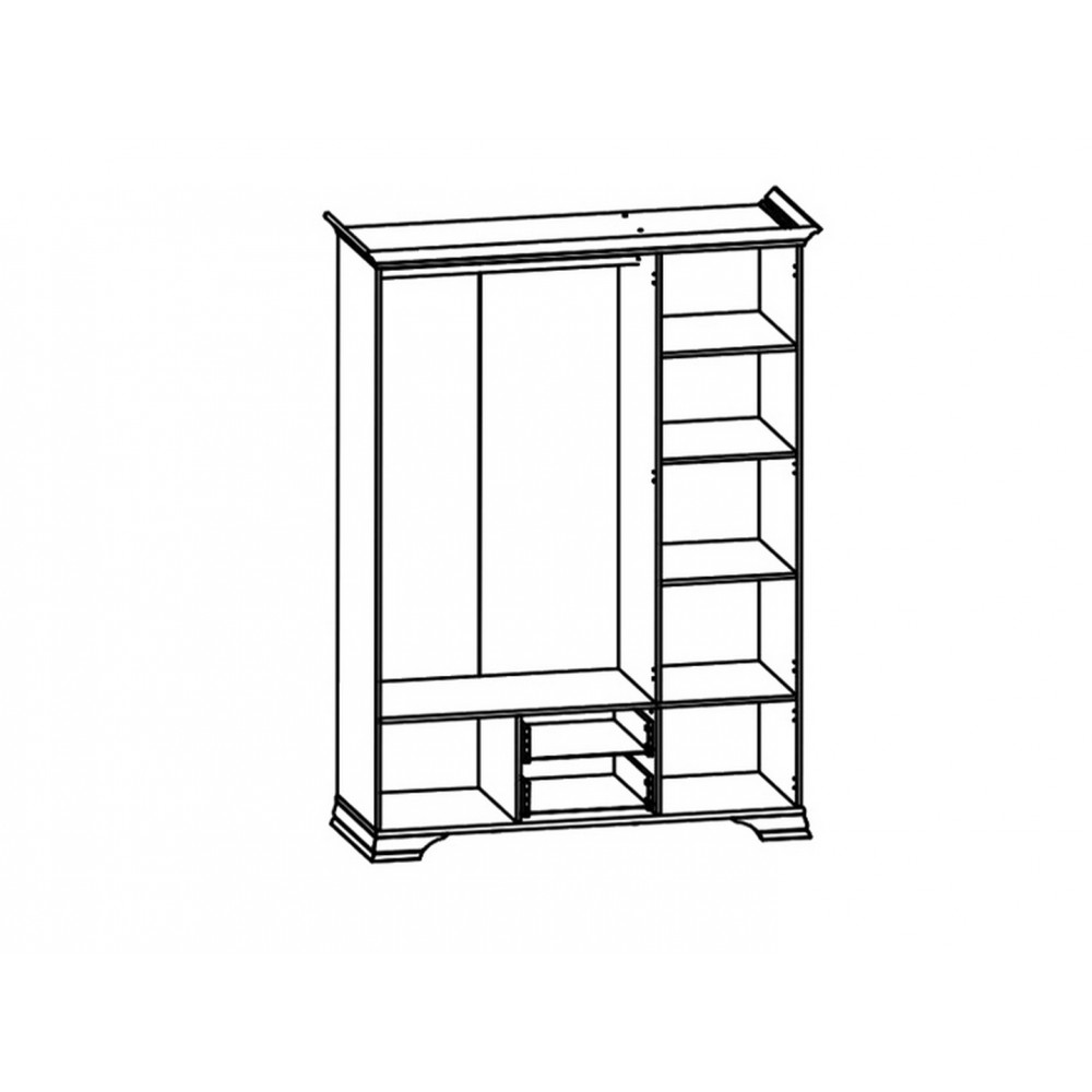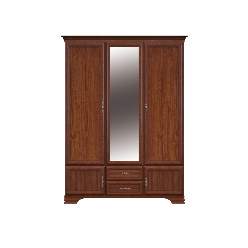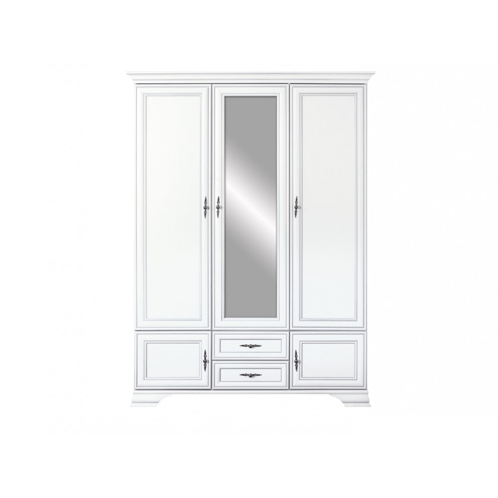 В верхней части расположены 3 распашных двери.За правой боковой глухой дверью расположены полки.За дверями с зеркальными вставками расположена стационарная штанга для одежды.В нижней части шкафа расположены 2 ящика с распашными дверями и 2 выдвижных ящика на металлических роликовых направляющих.Металлические ручки с декоративной накладкой.Карниз - планка декоративная из МДФ.Двери и панели ящиков - рамочно-филенчатой конструкции.Цвет: Белый.Цвет: Каштан.