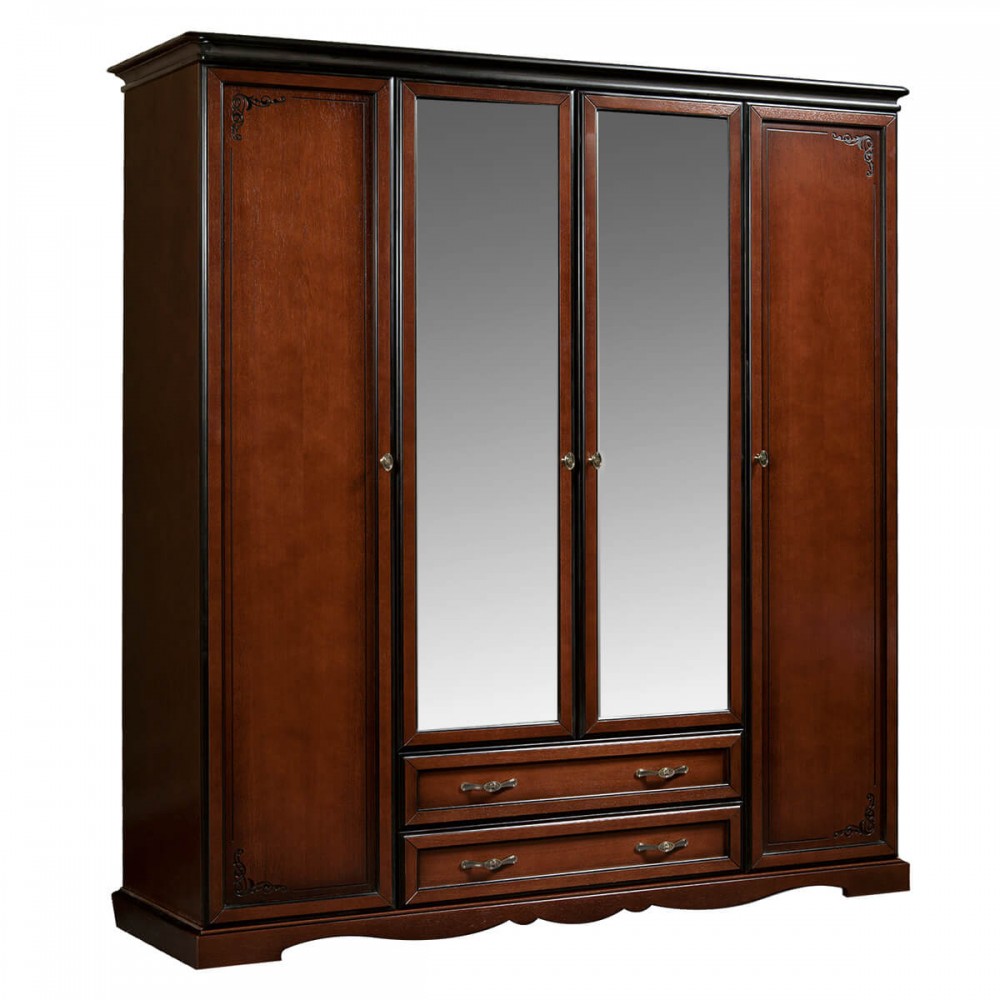 Количество дверей: 4-х дверный.Комплектация: зеркала.Фурнитура: лицевая фурнитура от компании Boyard (Китай), петли от Hettich (Германия) и направляющие от Westline (Китай).Цвет: Альпийский дуб; Махагон.Фасад и каркас: МДФ облицованный шпоном (дуб).Карниз: клееный массив древесины (дуб).