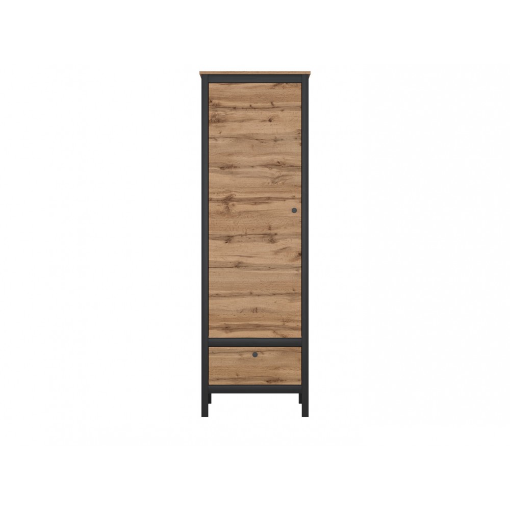 За распашной дверью расположены 4 полки для хранения вещей.Дверь может устанавливаться как с правой, так и с левой стороны.1 выдвижной ящик на металлических шариковых направляющих полного выдвижения.Круглые металлические ручки.Высокие ножки.Черная матовая декоративная планка имитирует металл.Цвет корпуса: Дуб вотан / черный матовый.Цвет фасада: Дуб вотан.